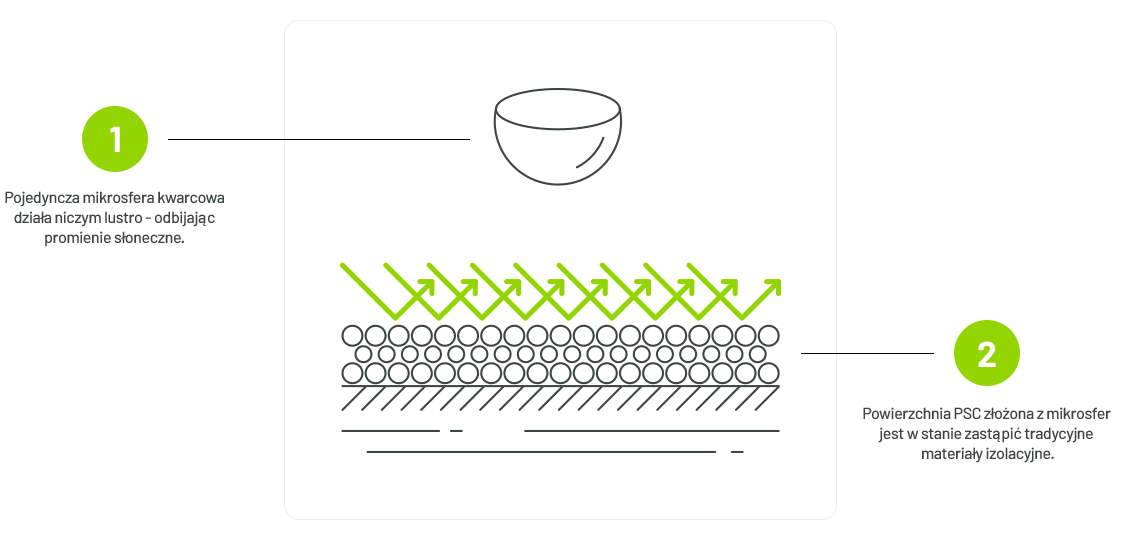 Pojedyncza mikrosfera kwarcowa działa niczym lustro - odbijając promienie słoneczne. Powierzchnia PSC złożona z mikrosfer jest w stanie zastąpić tradycyjne materiały izolacyjne.
